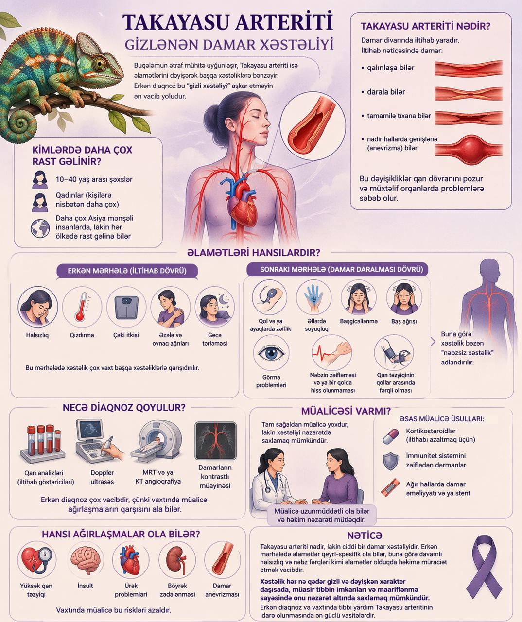 Təbiətdə bəzi canlılar varki, təhlükə hiss etdikdə rəngini dəyişərək ətraf mühitə uyğunlaşır. Məsələn, buqələmun ətraf şəraitə uyğun olaraq rəngini dəyişə bilir və bu xüsusiyyət onu digər canlılardan fərqləndirir. İnsan orqanizmində isə bəzi xəstəliklər var ki, onlar da buqələmun kimi “gizlənməyi” bacarır - yəni əlamətlərini dəyişərək başqa xəstəliklərə bənzəyir və diaqnozu çətinləşdirir. Takayasu arteriti məhz belə xəstəliklərdən biridir.